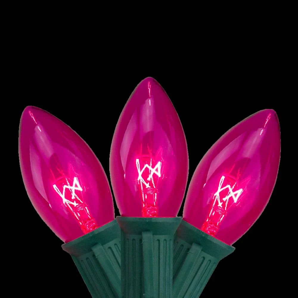 Product Features: Color: transparent pink bulbs/green wire. Number of bulbs on string: 25-Bulb size: C9 Spacing between each bulb: 12 in. Lighted length: 24 ft. Total length: 25 ft. 6 in. lead cord. 6 in. tail cord. Additional Product Features: Super bright bulbs. If 1-bulb burns out the rest will stay lit. UL listed for indoor or outdoor use. Bulbs easily screw in and out. Contains end connector which allows you to connect multiple lighted items together (not to exceed 210-Watt). Wire gauge: 20. 120-Volt 60 Hz, 1.46 Amp, 175-Watt.