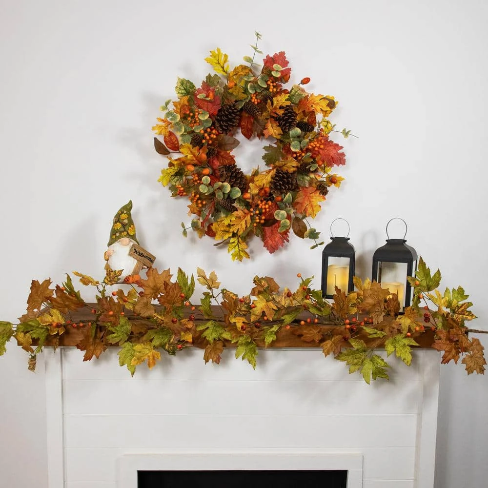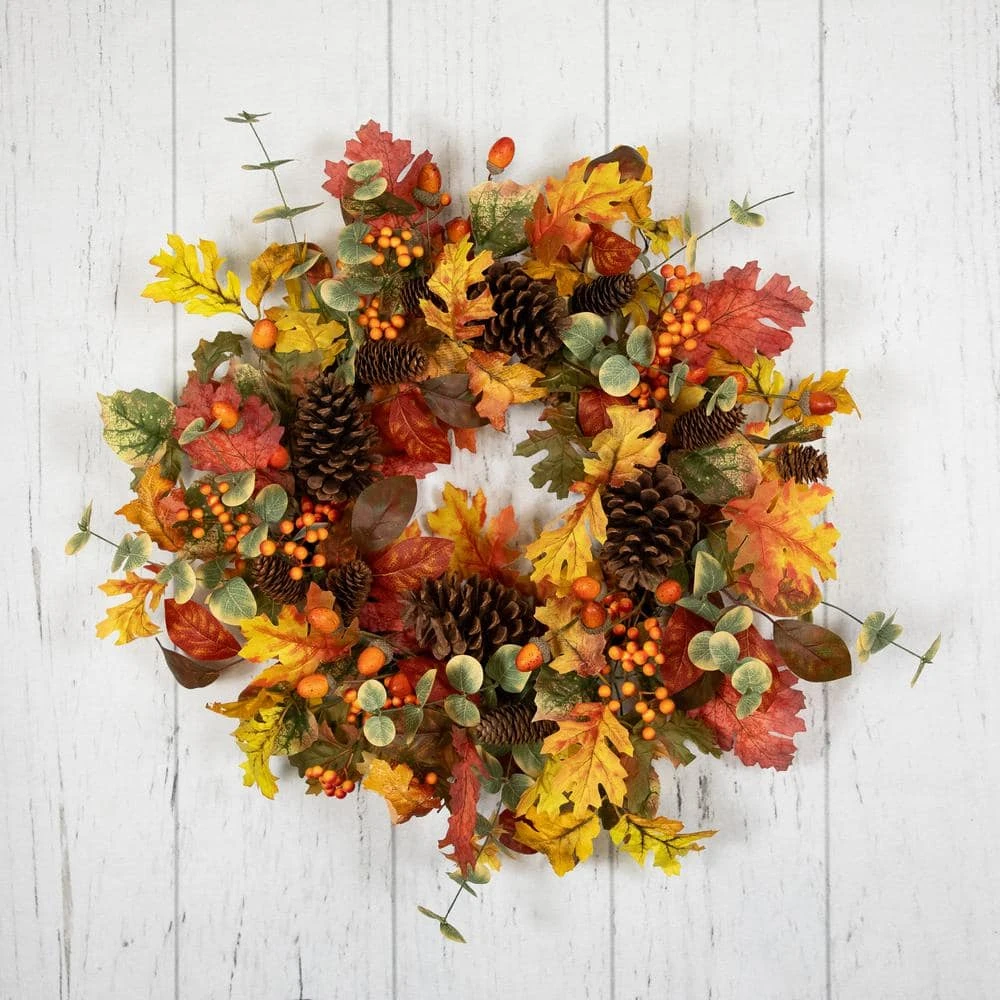 Celebrate the cozy charm of autumn with our beautiful artificial fall wreath. Bursting with the vibrant hues of the season this wreath features lush green fiery red golden yellow and burnt orange leaves intricately arranged to evoke the spirit of fall. Adorned with rustic pinecones plump berries and charming acorns each element adds a touch of woodland elegance. Set against a natural twig grapevine backing this wreath brings the beauty of the outdoors to your doorstep welcoming guests with warmth and style. Embrace the splendor of fall and adorn your home with this timeless symbol of the season. Product Features: Fall leaves artificial wreath. Designed with fall leaves in hues of green red yellow and orange. Decorated with pinecones berries and acorns. No assembly required – wreath comes in 1-piece. Natural twig grapevine backing for hanging. Recommended for indoor use – if using outdoors place under a covered area. Dimensions: 26 in. Dia (measured from outermost tip to outermost tip across the wreath). Material(s): polyester/twig/foam.
