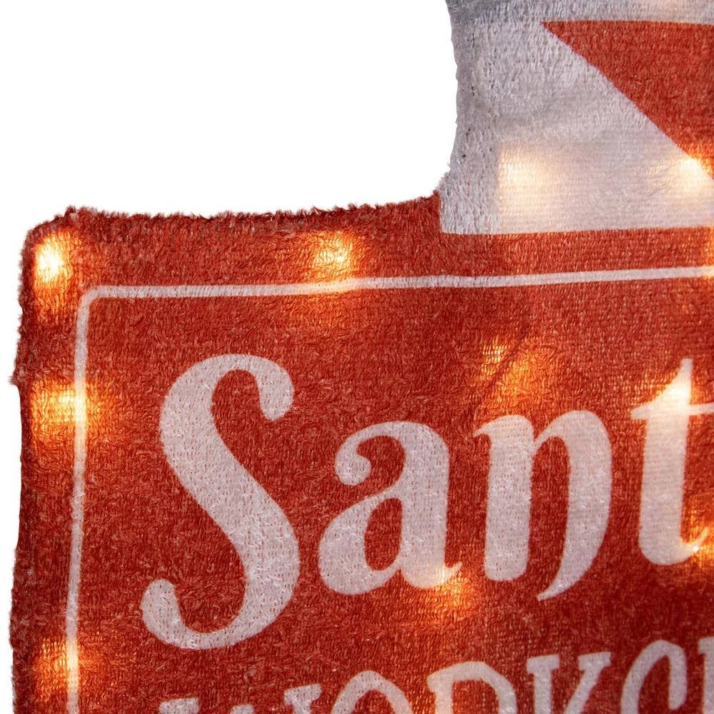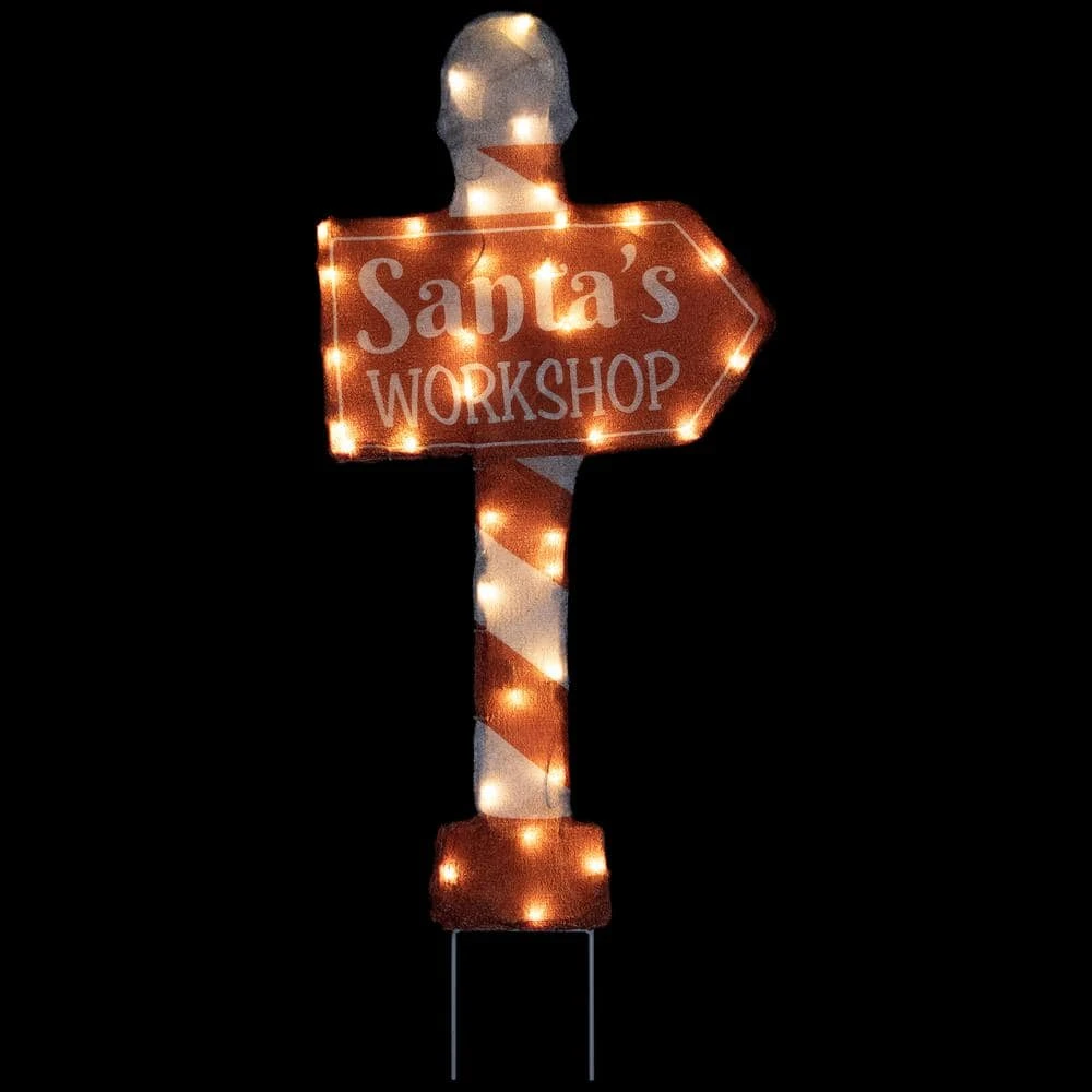 Transform your front yard into a Winter wonderland with our Santa’s Workshop yard sign. This enchanting display features warm white LED lights that bring Santa’s workshop to life casting a cozy glow on your outdoor festivities. Easy to assemble with included lawn stakes and a sturdy H-shaped metal ground stand this festive sign adds a touch of magic to your holiday decor. Spread joy and cheer with this charming addition that captures the spirit of the season creating a merry atmosphere for all who pass by. Product Features: Santa’s workshop sign Christmas yard decoration. Color: warm white bulbs/white wire. Bulb size: concave wide angle. Bulb type: LED. Bulb count: 35. 44 in. white lead cord. Additional Product Features: Easy assembly no tools required. Ground stakes included. Weather-resistant H-shaped metal stand for stability. Contains 1 plug with end connector allowing you to stack multiple lighted decorations together (not to exceed 210-Watt). Collapsible construction for easy storage. UL certified and approved for indoor/outdoor use. 125-Volt 3 Amp. Dimensions: 30 in. H x 15 in. W x 0.05 in. D. Material(s): metal/plastic bulbs/wire/fabric.
