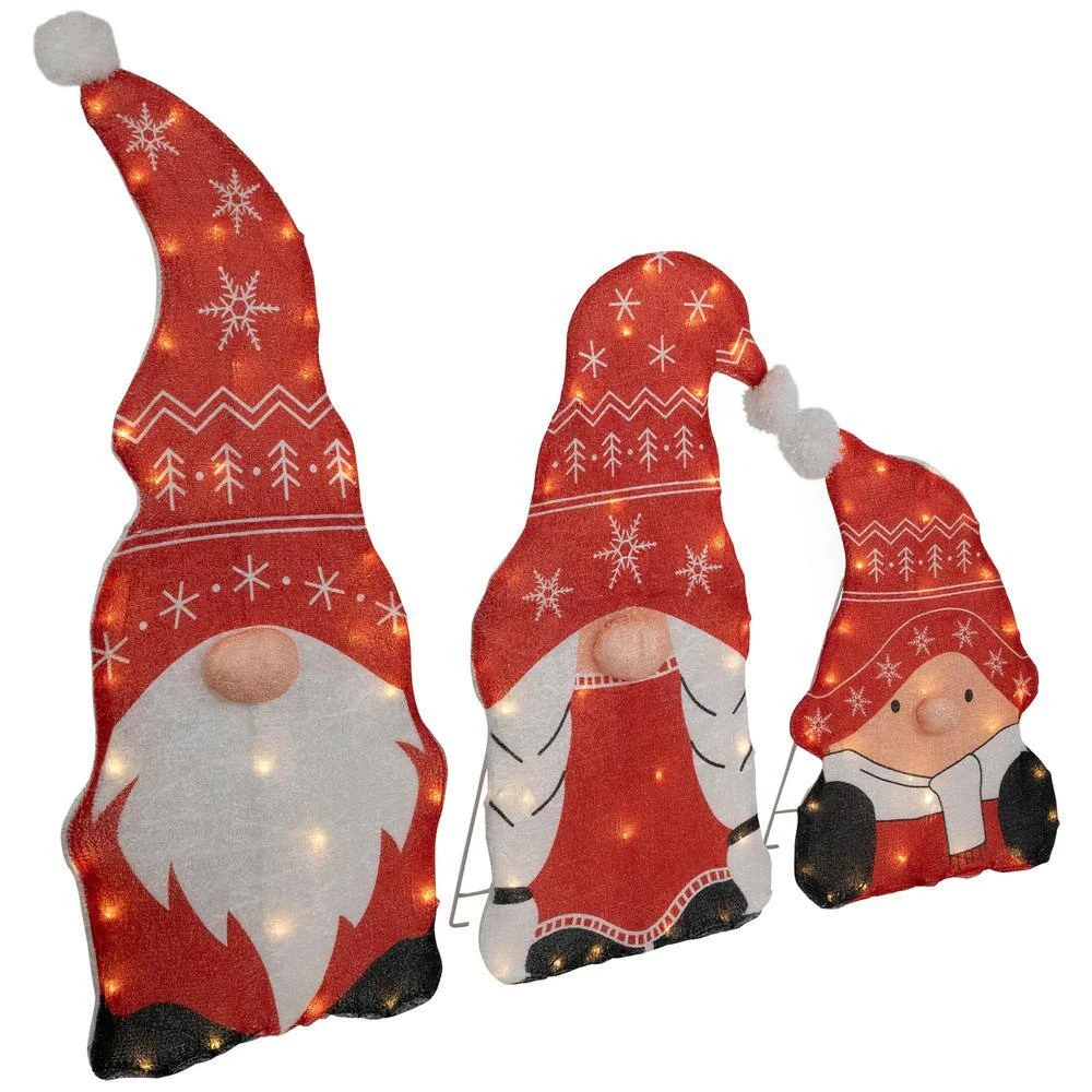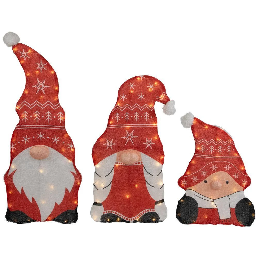 Transform your yard into a whimsical Winter wonderland with our enchanting lighted gnome family Christmas outdoor decoration. This charming trio includes a gnome dad gnome mom and an adorable gnome baby all dressed in festive red and white attire. The warm white LED lights add a magical glow creating a festive atmosphere. Crafted with durability in mind each gnome comes with its own metal easel for stability ensuring they stand tall and proud in your outdoor display. The set also includes metal lawn stakes offering versatility in how you showcase these delightful gnomes – whether together as a family or individually throughout your yard. Product Features: Gnome family Christmas yard decoration. Color: warm white bulbs/white wire. Bulb size: concave wide angle. Bulb type: LED. Bulb count: Papa gnome: 35. Mama gnome: 30. Baby gnome: 30. Each gnome comes with a 44 in. white lead cord. Additional Product Features: Display them together or individually. Easy assembly no tools required. Ground stakes and metal clips included. 3 weather-resistant metal easel stands for stability. Each contains 1 plug with end connector allowing you to stack multiple lighted decorations together (not to exceed 210 watts). Collapsible construction for easy storage. UL certified and approved for indoor/outdoor use. 125-Volt 3 Amp. Dimensions: Papa gnome: 30 in. H x 13 in. W. Mama gnome: 24 in. H x 14.5 in. W. Baby gnome: 18.5 in. H x 12.5 in. W. Material(s): metal/plastic bulbs/wire/fabric.