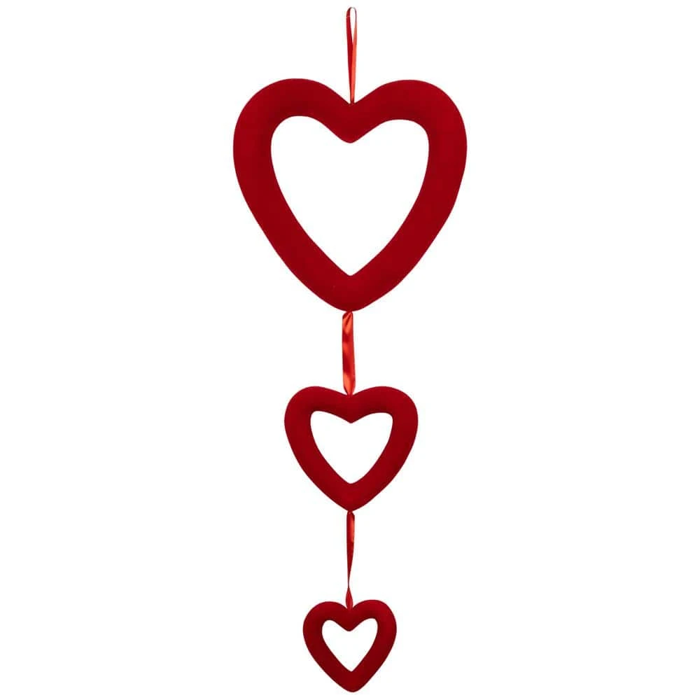 Create a dreamy and memorable Valentine’s Day with this trio of hanging heart decoration. Each red colored, open shape heart is a different size starting with the largest at the top and attached by a shimmering red ribbon. Designed for versatility, these hearts can be displayed effortlessly in various settings. Hang them from a ceiling, suspend it against a wall, or let it grace the entrance of a room to create a stunning focal point. Product Features: Valentine’s Day heart trio decoration. Red hearts have cut out design. Ribbon provides for easy hanging. For indoor use only. Dimensions: 36 in. high. Material(s): foam/fabric.