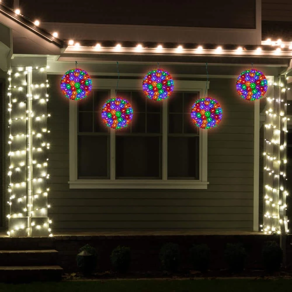 Transform your outdoor space into a magical wonderland with our stunning lighted hanging starlight sphere. Adorned with vibrant multi-color LED lights this enchanting decoration features 3-dimensional stars arranged on a sphere casting a mesmerizing glow that will dazzle your guests and spread holiday cheer throughout the neighborhood. Perfect for adding a holiday touch to your Christmas display it’s sure to be a shining centerpiece of your seasonal decor. Product Features: Number of bulbs on sphere: 100. Number of 3-dimensional stars on sphere: 100. Bulb color: multi-color. Bulb size: concave wide angle. Comes ready-to-hang on a 31 in. green cord (removable). 12.75 ft. green lead cord. Additional Product Features: LED lights use 90% less energy. Durable non-glass replaceable bulbs. Cool to the touch. UL listed for indoor or outdoor use. Contains with 1 plug with end connector allowing you to stack multiple lighted items together (not to exceed 210-Watt). Comes with spare bulbs and replacement fuse. 1-Volt 60 Hz .2 Amp and 24-Watt. Dimensions: 7.5 in. Dia. Material(s): plastic/wire/glass bulbs.
