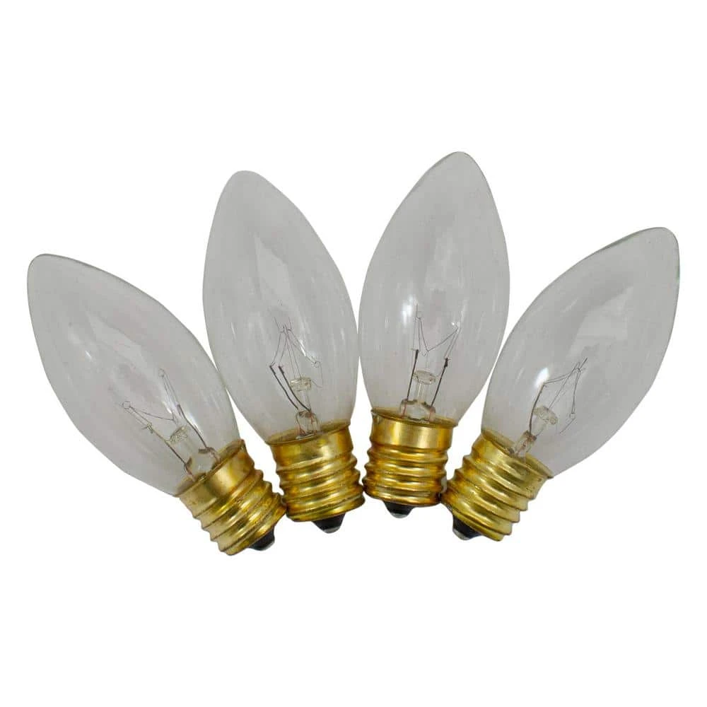 Never find yourself without a replacement bulb when a light goes out. keep yourself prepared this holiday season. No rushing and parading each store until you find the right 1s. searching at the last minute can be frustrating. Our transparent replacement bulbs are the perfect secret weapon when that holiday snag hits be the hero of Christmas. Product Features: 4-piece Christmas replacement bulbs. Finish: transparent. Color: clear. Bulb size: C9. E17 brass base. 120-Volt 7-Watt. Glass bulbs with gold intermediate bases. UL certified and approved for indoor or outdoor use. Material(s): glass/metal. Dimensions: 3 in. H x 1 in. Dia.