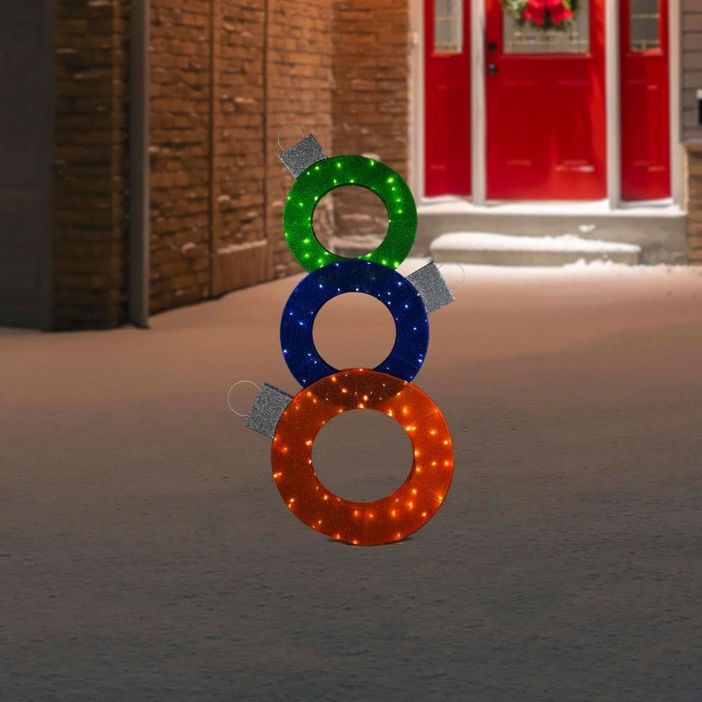Get into the holiday spirit with this lighted stacked ornament yard decoration. The ornaments are red blue and green with silver caps. Stacked from largest to smallest they are filled with clear lights. it will provide an ample amount of illumination for your yard. Also a perfect addition to your porch entryway tabletop or anywhere you wish to add a little holiday charm. Product Features: Christmas stacked ornament decoration. Pre-lit with 130 clear lights. Bulb size: micro. Bulb type: incandescent. 4.5′ clear lead cord. UL outdoor adaptor. Comes with replacement bulbs and spare fuses. Some assembly required; ground stakes not included. UL approved and certified for indoor or outdoor use. 120V 60Hz 0.20A. Recommended for outdoor. Dimensions: 31.5in.H x 26.75in.W x 6.5in.D. Material(s): metal/plastic/wire/fabric