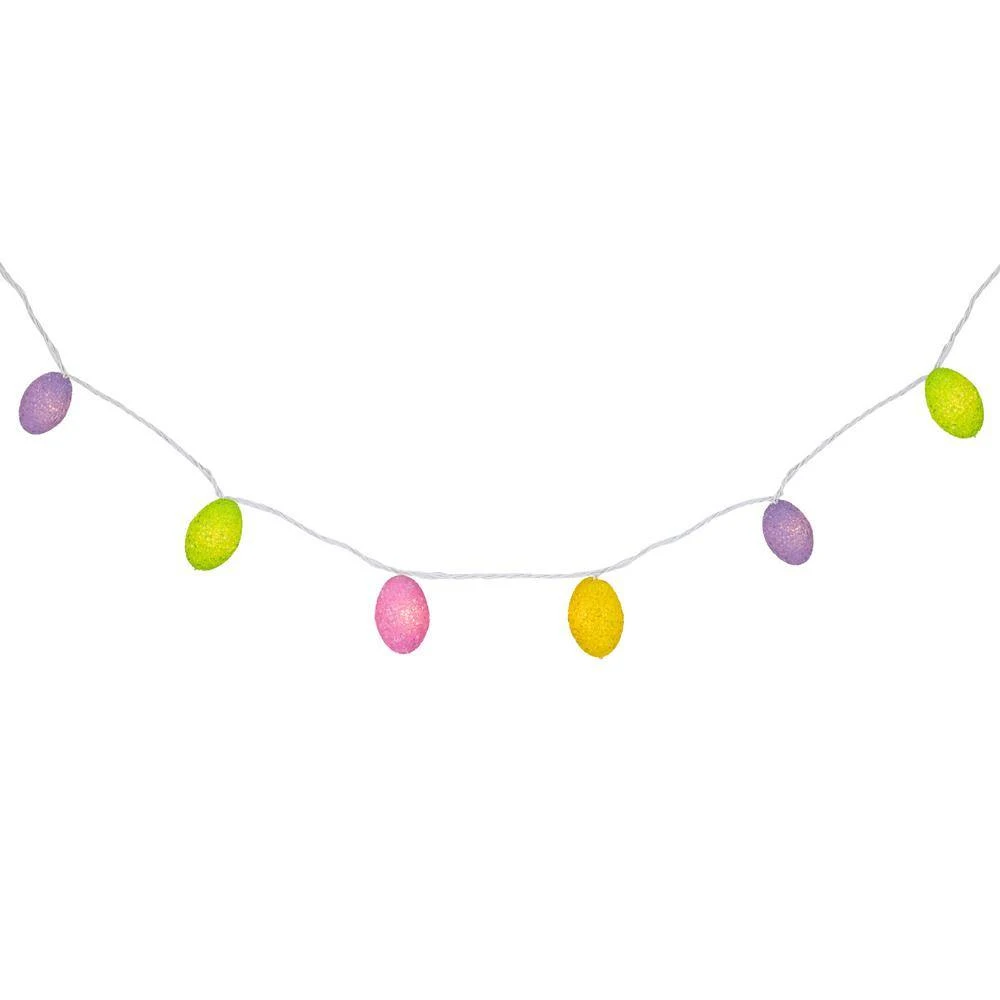 Product Features: Color: clear bulbs/white wire Pastel colored egg-shaped light covers Number of bulbs on string: 10 Bulb size: mini Spacing between each bulb: 9.5 in. Lighted length: 7.25 ft. Total length: 9.6 ft. 24 in. lead cord 5 in. tail cord Additional Product Features: If 1 bulb burns out the rest will stay lit Contains end-to-end connectors which allows you to connect multiple lighted items together (not to exceed 210-Watt) Comes with replacement bulbs and spare fuse UL listed for indoor or outdoor use Wire gauge: 22-Gauge 120-Volt 60 Hz 0.08 Amp 9.6-Watt. Dimensions of each egg: 2.5 in. H x 1.75 in. W Material(s): plastic/glass bulbs/wire. Note: basket shown is NOT included.