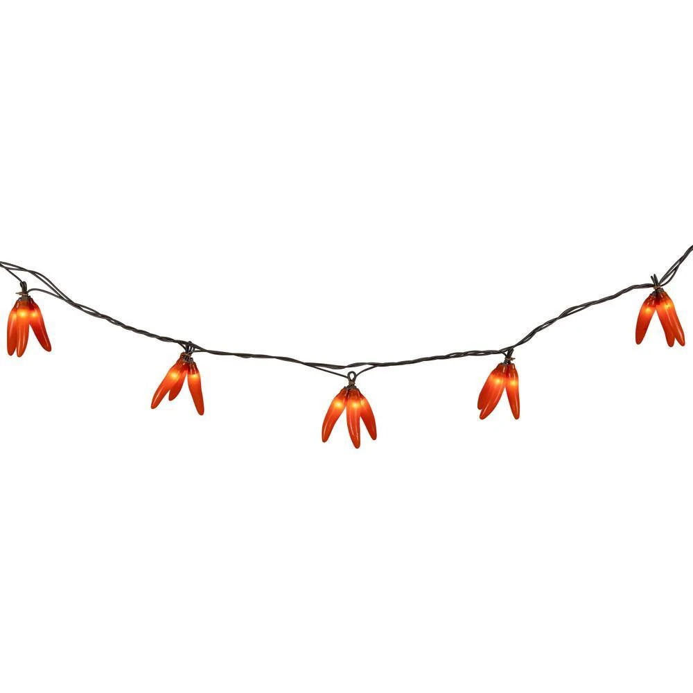 Set of 36 Red Chili Pepper Lights Item #G5 AmpD6511 Features: Color: clear bulbs/brown wire Number of bulbs on string: 36 Bulb size: mini-bulb Spacing from the plug to the first cluster: 24 in. Tail: 5 in. Spacing between clusters: 8 in. Total string length: 9 ft. 10 in. Light cover dimensions: 3 in. L x 0.75 in. W Additional Product Features: Clusters come in groups of 3 lights for a total of 12 clusters per string UL listed for indoor and outdoor use End-to-End connectors allow you to connect multiple sets together (210-Watt maximum) 120-Volt 60 Hz 0.12 Amp 14.4-Watt Comes with spare bulbs and fuse.