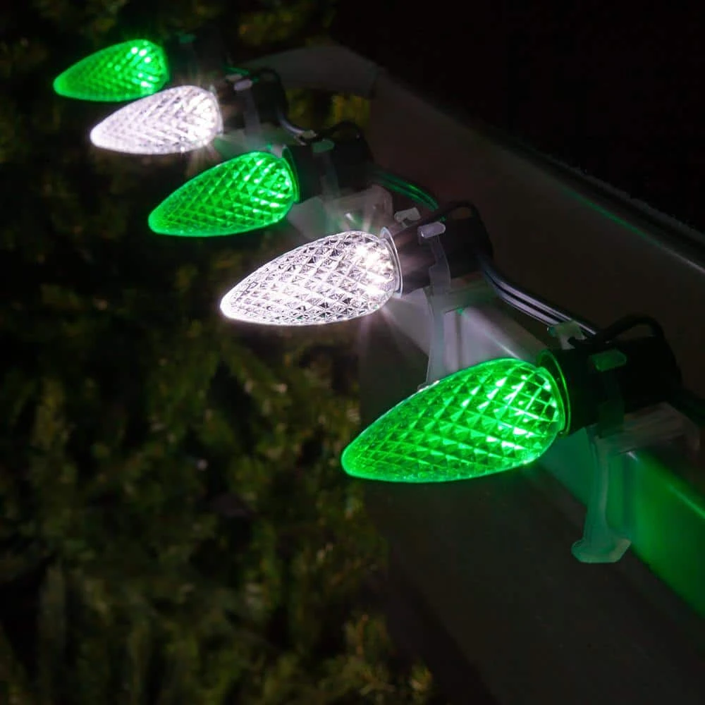 - 25 green and 25 cool white OptiCore C9 LED bulbs and one 50 ft. green E17 stringer with sockets spaced 12 in. apart, 6 in. leads with fused polarized male plugs, 6 in. tails with female plugs for end to end connections, 50 ft. total light kit length, to assemble, simply twist bulbs into sockets