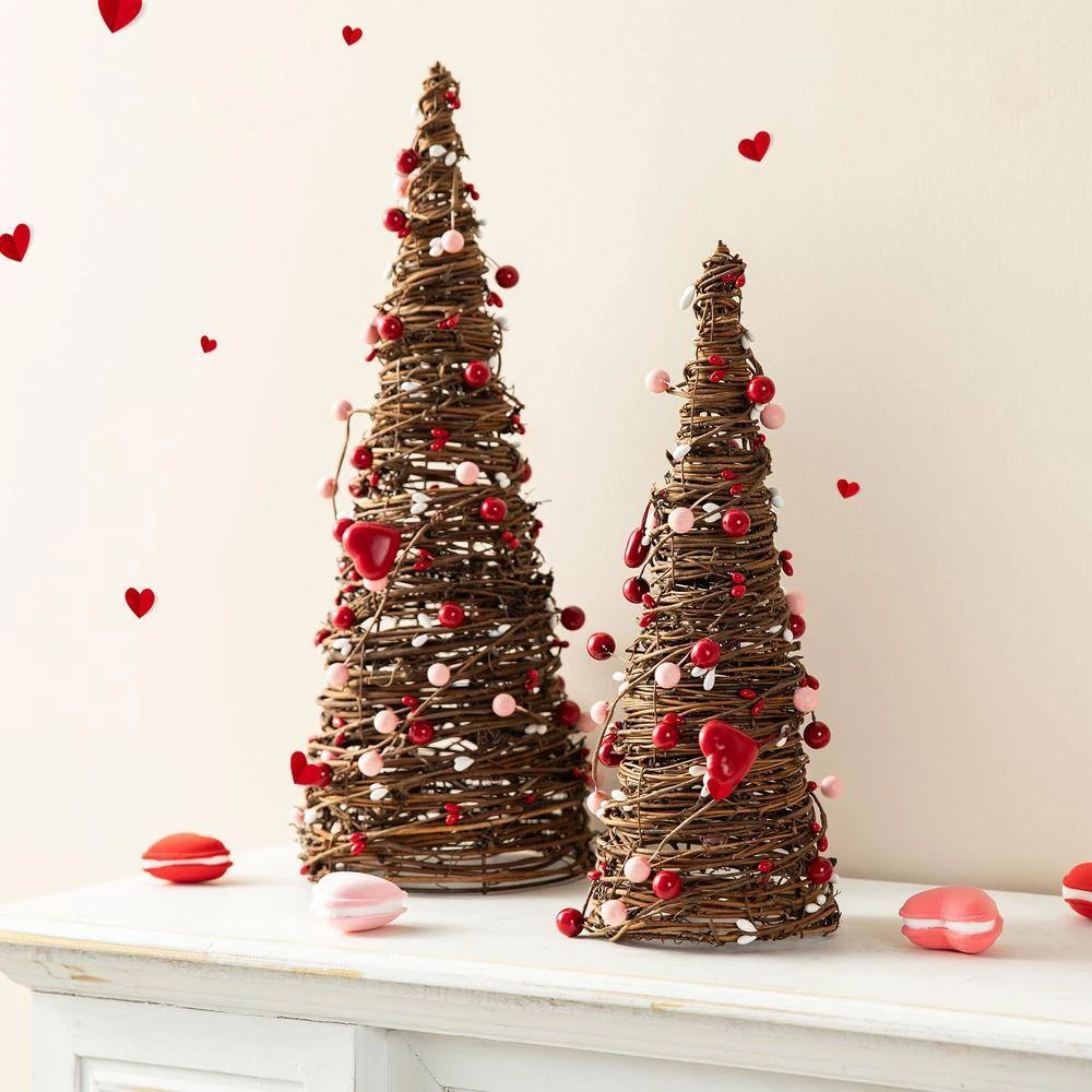 Elevate your holiday decor with this (set of 2) handcrafted rattan cone trees. Each cone tree features a distinctive shape adorned with heart-shaped berry accents. It creates a warm and festive atmosphere.