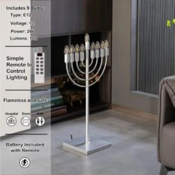 Installation Instructions: Each cable attached to the LED bulb has a corresponding number from 1 to 10. Make sure to insert the bulbs into the holder according to the numbered sequence as they are programmed in the remote, this ensures that the program corresponds to the sequence of the bulbs from 1 to 10, following a one-to-one pairing. Cables 1 to 9 are for the individual bulbs, while the 10th cable is for the on/off option for all the lights. Experience enhanced Hanukkah celebrations with our new and improved menorah, featuring brighter LED lights This beautifully crafted menorah, with its LED flame-shaped light bulbs is perfect for Hanukkah and other festive occasions. With dimensions of 17.32 in. W, 9.84 in. L and 34.84 in. H, it’s ideal for displaying near windows, in home offices, living rooms, dining rooms, entryways, dorm room and even in your kitchen, this menorah is designed to catch the attention of your guests and perfectly complement your Hanukkah theme and traditional home decor. Let the festival of lights illuminate your home day and night with this stunning and functional menorah.