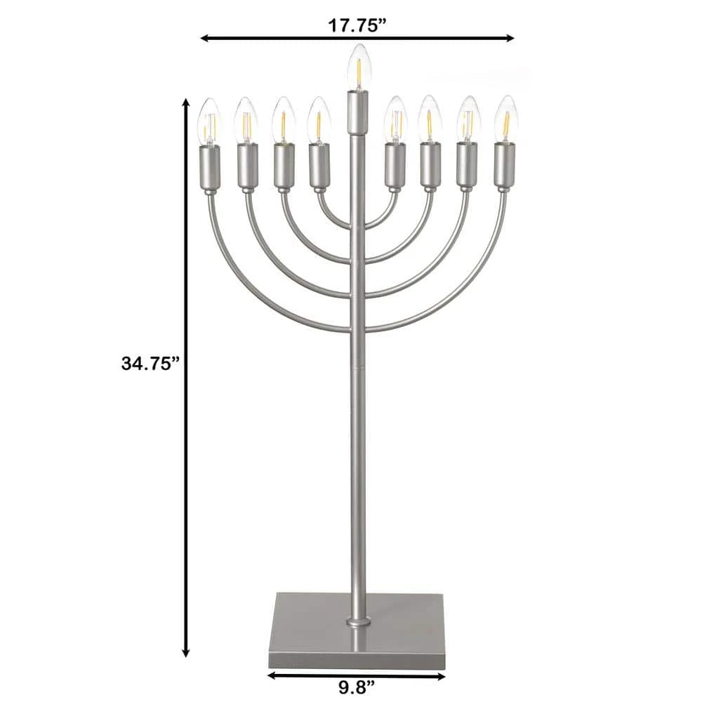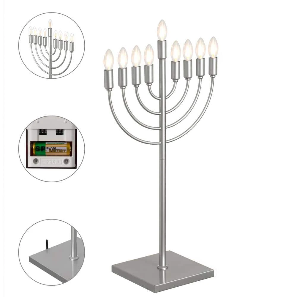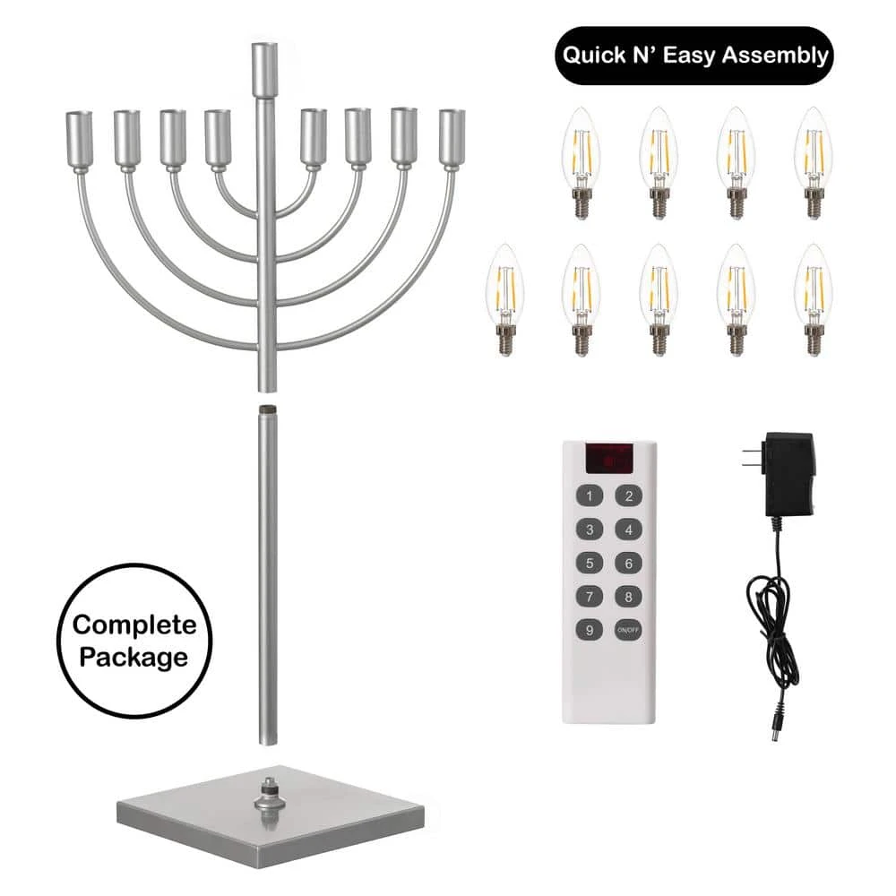 Installation Instructions: Each cable attached to the LED bulb has a corresponding number from 1 to 10. Make sure to insert the bulbs into the holder according to the numbered sequence as they are programmed in the remote, this ensures that the program corresponds to the sequence of the bulbs from 1 to 10, following a one-to-one pairing. Cables 1 to 9 are for the individual bulbs, while the 10th cable is for the on/off option for all the lights. Experience enhanced Hanukkah celebrations with our new and improved menorah, featuring brighter LED lights This beautifully crafted menorah, with its LED flame-shaped light bulbs is perfect for Hanukkah and other festive occasions. With dimensions of 17.32 in. W, 9.84 in. L and 34.84 in. H, it’s ideal for displaying near windows, in home offices, living rooms, dining rooms, entryways, dorm room and even in your kitchen, this menorah is designed to catch the attention of your guests and perfectly complement your Hanukkah theme and traditional home decor. Let the festival of lights illuminate your home day and night with this stunning and functional menorah.
